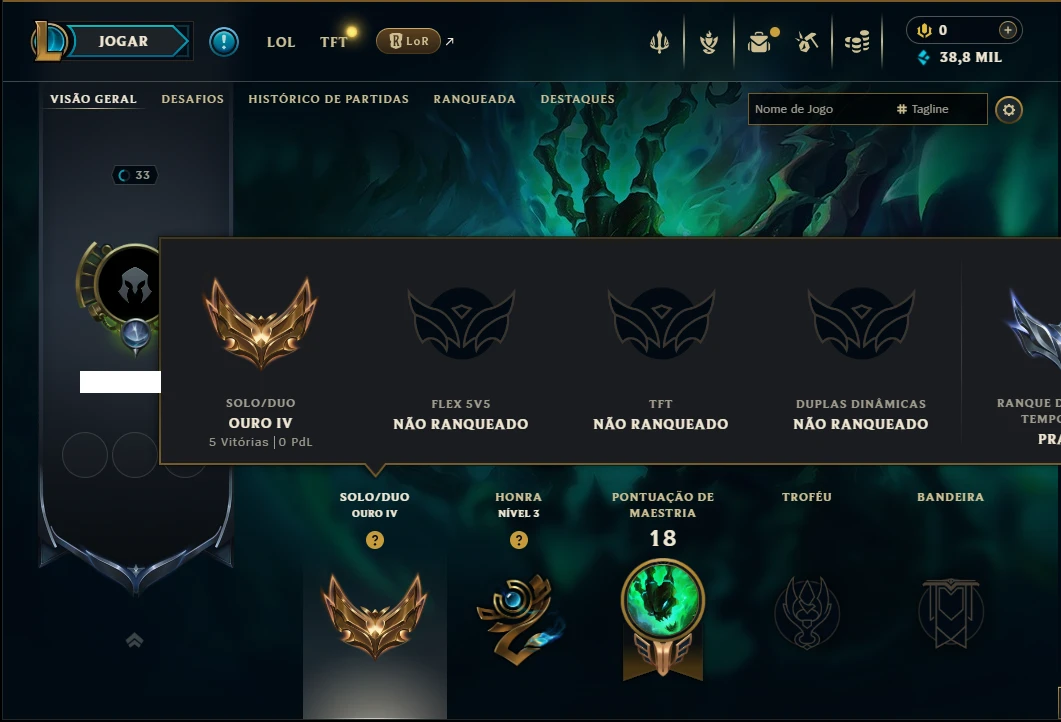 Ouro 4 com 35 Champs e 2 Skins - League of Legends LOL