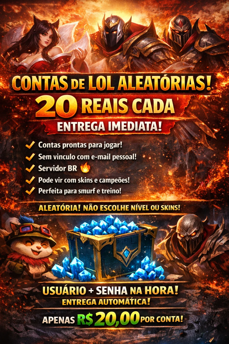 ⚠️ As contas são ALEATÓRIAS – não é possível escolher nível, skins ou campeões específicos. Cada compra = 1 conta.