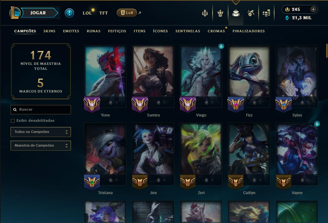 Conta Platina 2 com 130 Champs, Maestria 34 de Yone, 27 de Samira, 19 de Viego, 46 Skins, 2 Prestigios: Jarvan e MF, 1 Rara do Ryze Triunfante, 4 Vitoriosas, 21k de EA, 24 Cromas, 99 Ícones, 77 Emotes, 70 Essencias Miticas, 3 Reembolsos e Honra 4.
