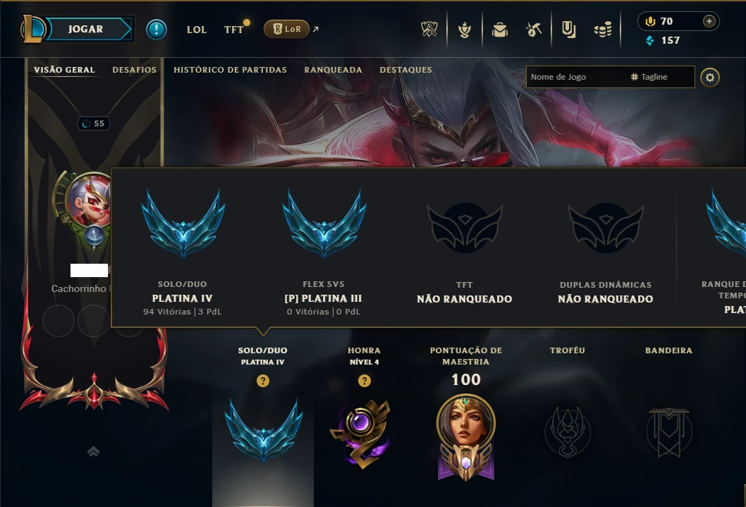 Platina 4 com 100 Champs e 17 Skins + 125 Essencias Miticas - League of Legends LOL