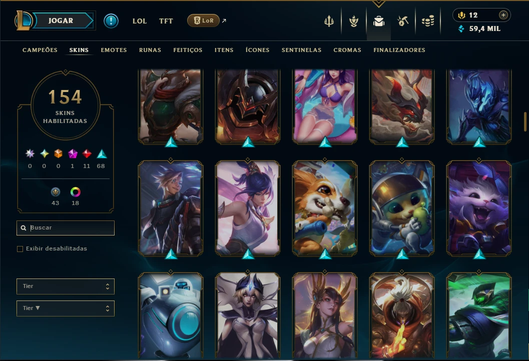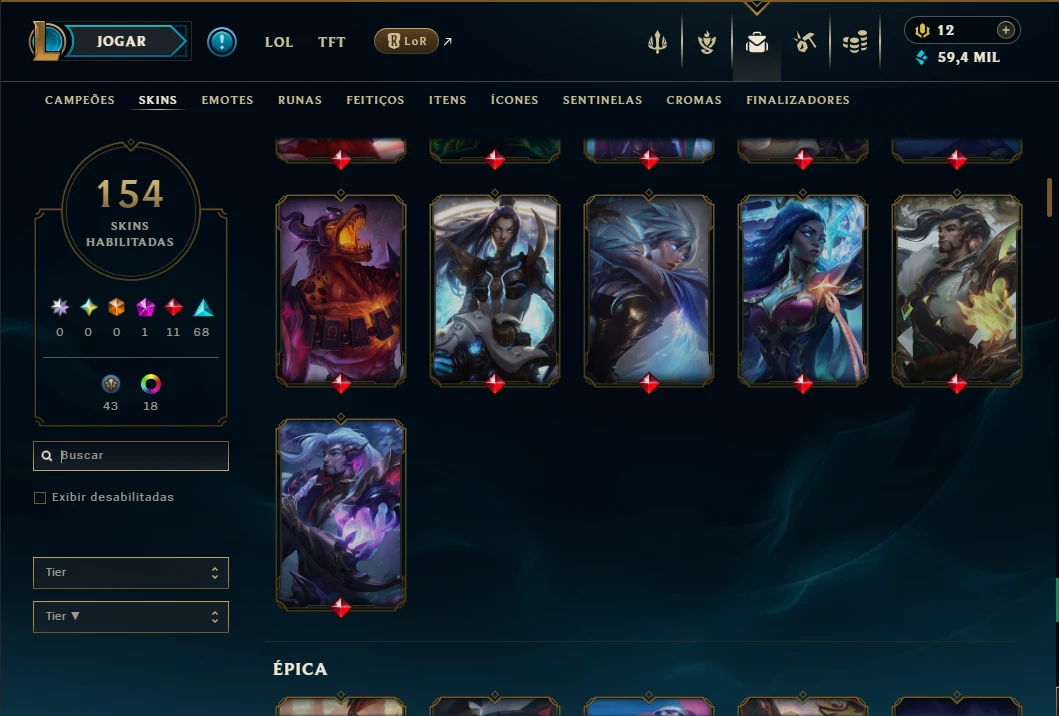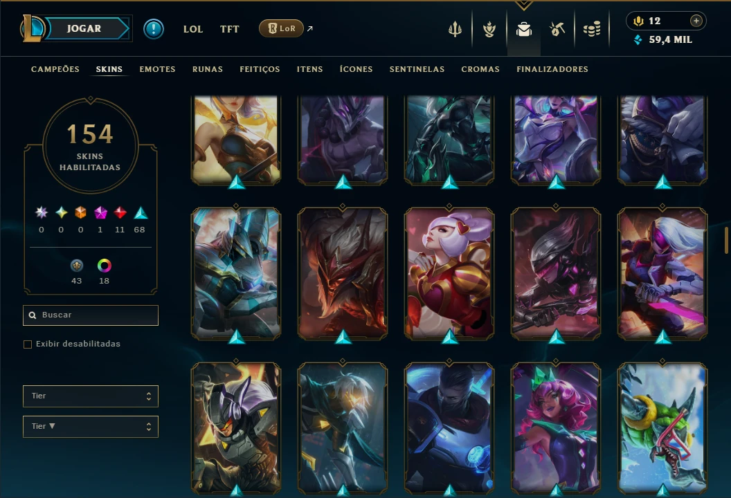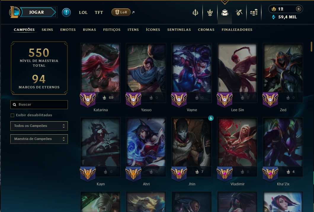 ( MID / JG / ADC ) - Conta Unranked com TODOS os Champs, Maestria 19 de Katarina, 15 de Yasuo, 12 de Vayne, 21 Maestrias acima de 7, 154 Skins, 59k de EA, 20 Cromas, 247 Ícones, 131 Emotes, 1 Fragmento de skin, 5 de Campeão, 3 Reembolsos e Honra 3.