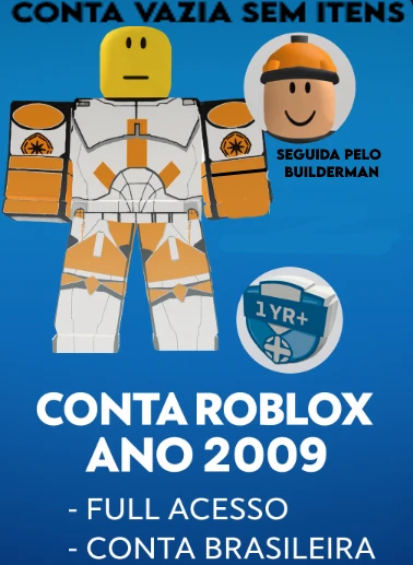 🧾 Resumo Básico da Conta Roblox (Ano 2009) 📅 Informações Gerais Ano de Criação: 2009 Origem: Brasil Tipo de Acesso: Full acesso (senha alterável, e-mail verificável, configurações desbloqueadas) Nome de Usuário: Pode ser original e nunca alterado, o que aumenta o valor histórico Popularidade: Seguido por perfis oficiais como builderman (em alguns casos)